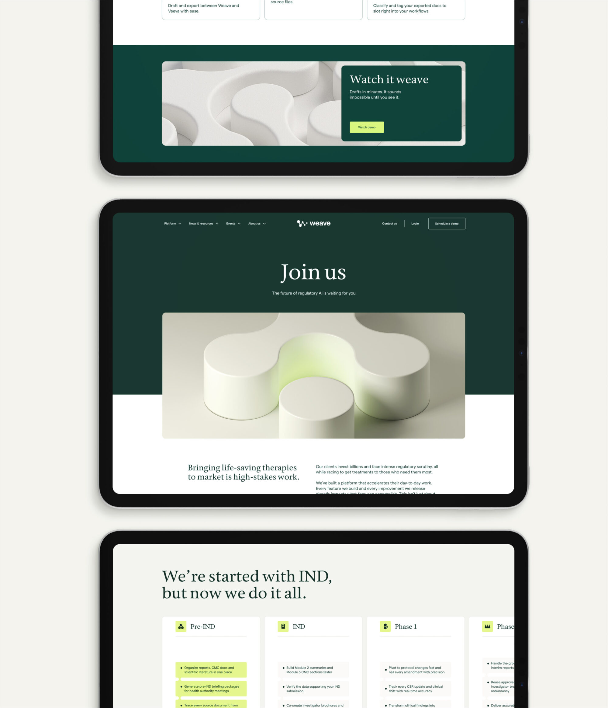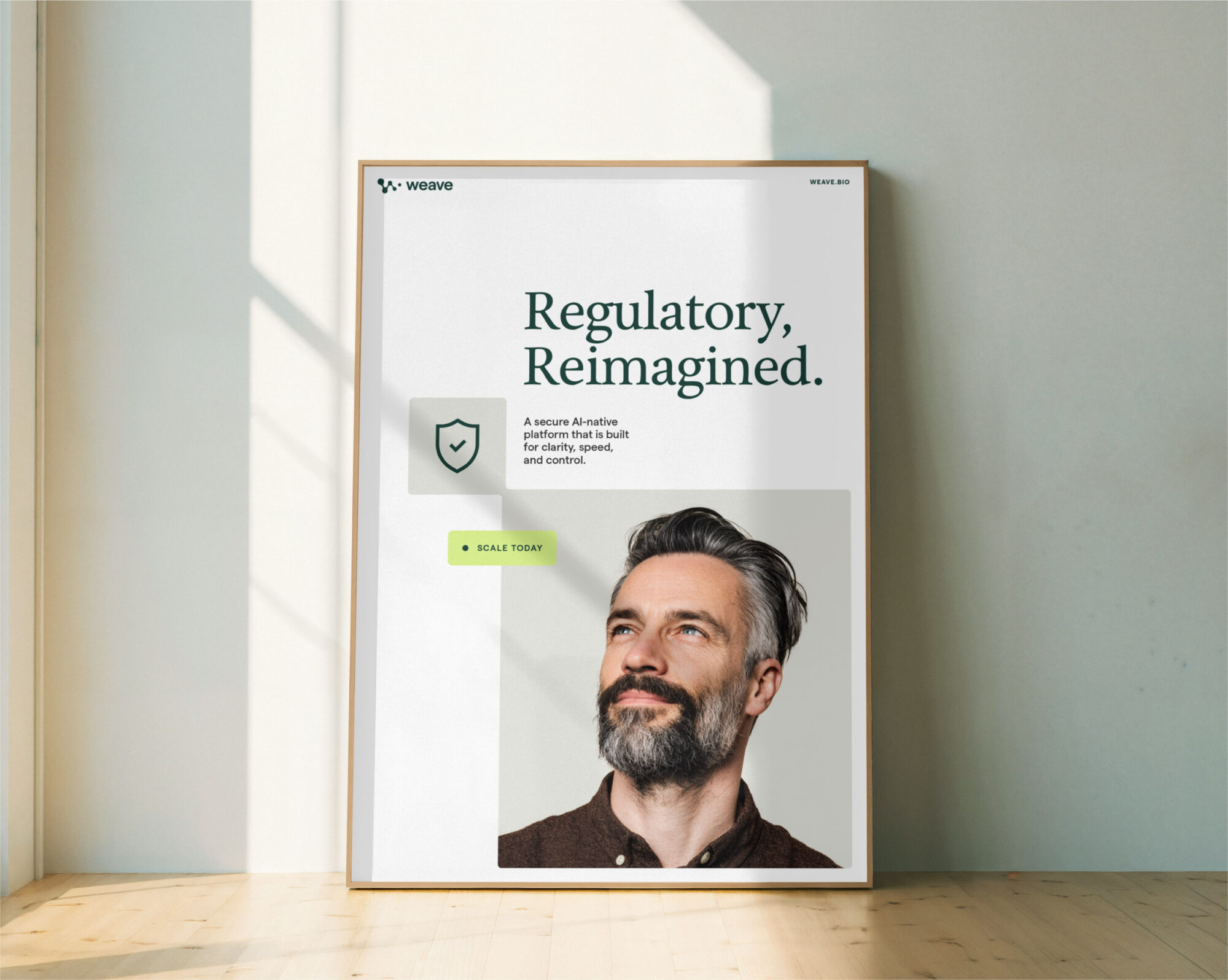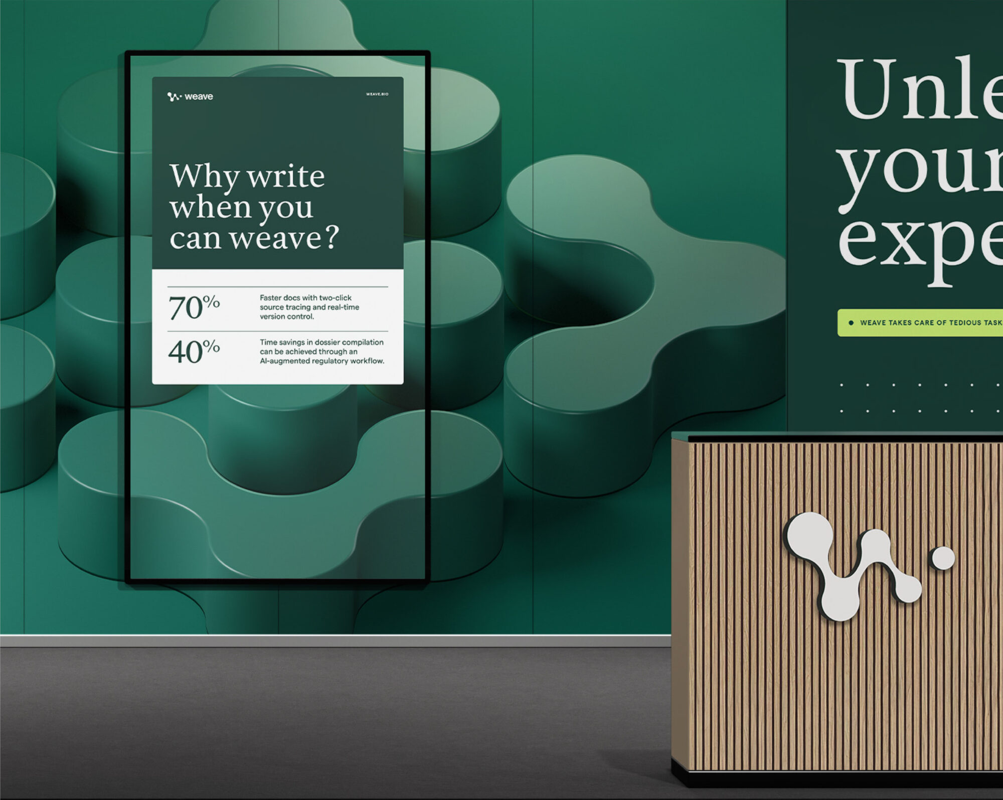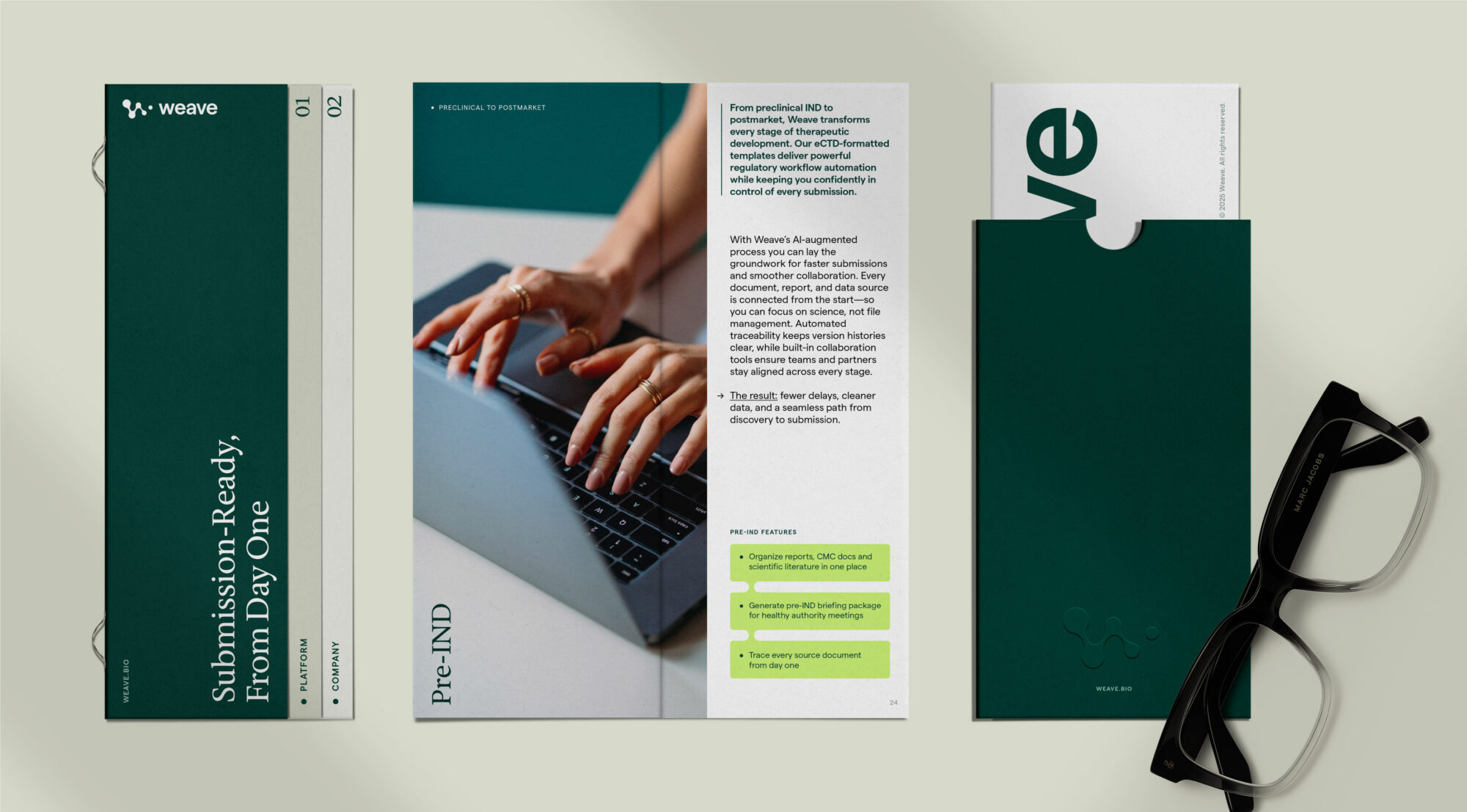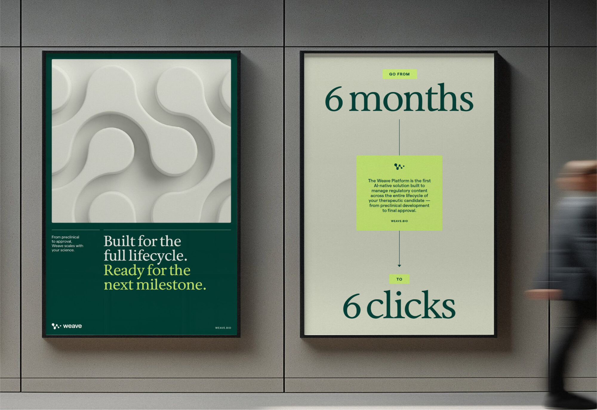 Weave Bio’s discerning clientele needed a system that could convey a sense of human warmth paired with elevated technical rigor. We developed a dynamic 3D graphic system inspired by the logo’s intersecting shapes—a signal of the platform’s continuous AI refinement and seamless integration of intricate regulatory data. Candid, in-motion photography humanizes the brand, while intuitive UI vignettes distill sophisticated product features into simple visual stories that build credibility quickly.